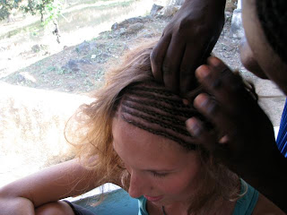 After much visiting and “snapping” of photos by request, we decided to head back. We loaded our gifts into some bags and a plastic crate. I soon realized that I was a big part of the plan on getting our gifts home – I would have to “tote” (carry stuff on my head African style). Of course, Hawah took the heavy load and I only had to tote a big bag of cassava and cabbage. However, it was actually quite heavy and we had to walk back three miles. By the way, I learned that toting is definitely the most efficient way to carry heavy loads for a long distance. The combined sight of me toting and my newly planted (braided) hair proved to be quite entertaining for the villagers as we walked out of town. Even 3 and 5 year old Asha and Sheku were given something to tote, although they quickly tired and soon were bawling their eyes out because of fatigue. About half way, I ended up making an emergency call to Joe to come pick them up on the bike.